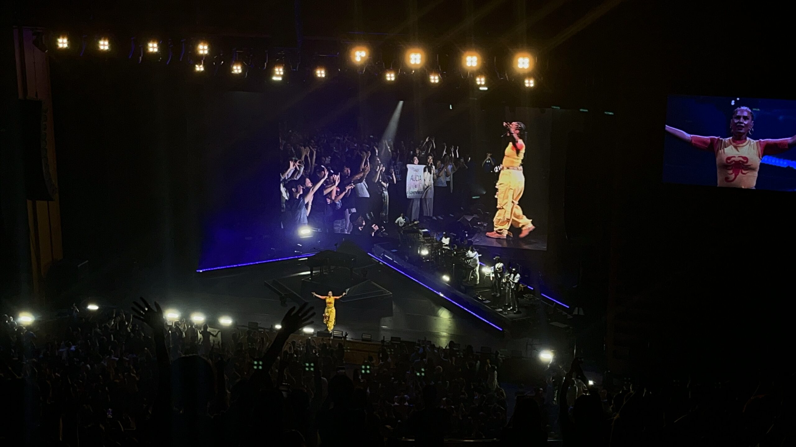 2日前のサマソニ東京はAIやAwichを招いた豪華客演やステージ演出、フェス向けのアレンジなどヘッドライナーとしての演出が目立ったが、東京国際フォーラムでは全く異なるアプローチ。まるで「MTVアンプラグド」もしくは来月開催される「blue note jazz festiva」を思わせるような、ピアノ、ギター、ストリングス、コーラスの音色を丁寧に響かせるホール特化型ステージとなった。音圧や広がりが均一に届く国際フォーラムの音響が最大限に生かされ、アリシアのピアノ弾き語りがこれ以上なく身近に感じられる瞬間が続いた。