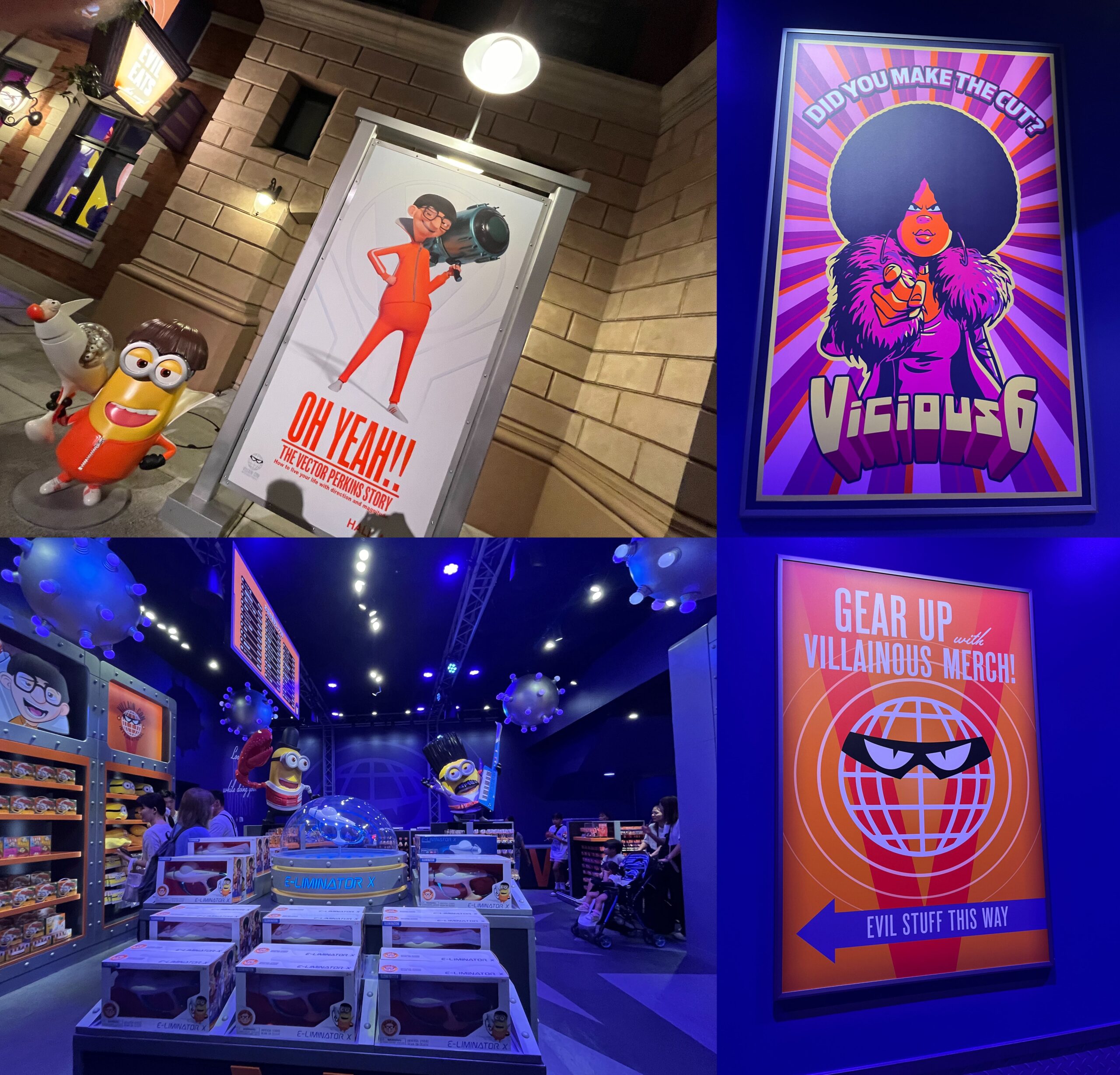 ゲストは最新ブラスター「イーリミネーターX」を手に、映画『ミニオンズ フィーバー』に登場した悪党グループ「ビシャス6」の新メンバーを目指す。動く歩道に乗りながらターゲットを撃ちまくる!やり込み要素満載な没入型アトラクションとなる。